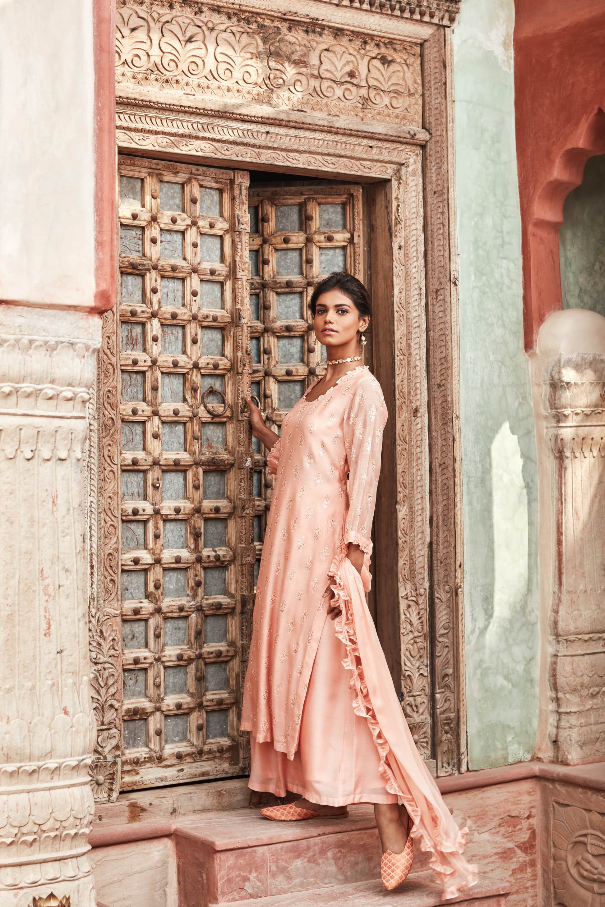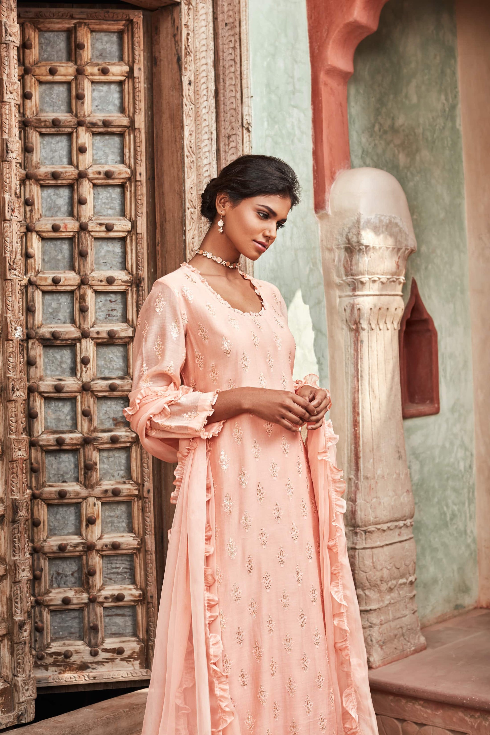 Peach silk Chanderi suit- Hand embroidered motifs on the kurta with flared pyjamas . Accented with a dupatta with ruffles on the border . A very simple yet elegent ensemble.